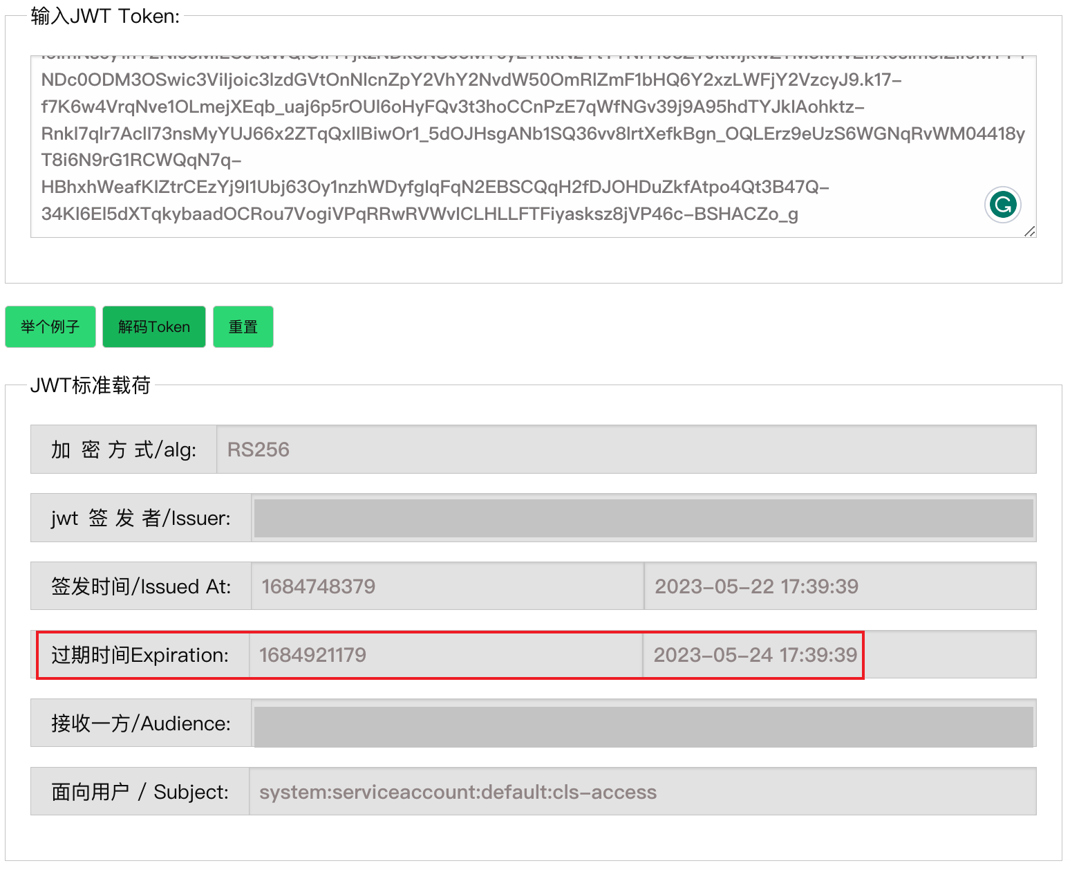 Use any tool that supports parsing JWT tokens to analyze the token and confirm its expiration time. If you can find an expiration field in the parsed result (a key containing "exp", as shown below), the platform will be unable to manage the import cluster after that time. In this case, stop and contact technical support.